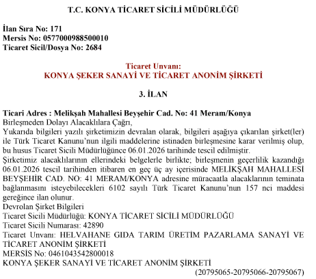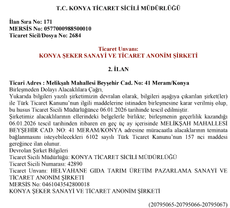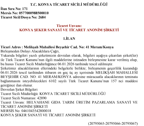 Konya Şeker Sanayi ve Ticaret Anonim Şirketi Helvahane İle Birleşme İşlemi Hakkında Özel Durum Açıklaması |